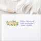 These return address labels feature a colourful watercolor floral image at the left side of the label, with your custom text in purple blue at the right. Colours used include tangerine, gold, yellow, blue, violet, green, and more. The images and text are placed on a white background. If you need to change the colour, size, location, or font of the text, choose Customise.