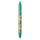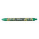 A pen with a cute pattern featuring yellow lemons and green lime fruit with stalks of leaves set on a dark green background.