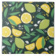 Ceramic tile with a cute pattern featuring yellow lemons and green lime fruit with stalks of leaves set on a dark green background.