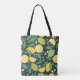 A personalised tote bag with a cute pattern featuring yellow lemons and green lime fruit with stalks of leaves set on a dark green background.