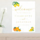 Modern Lemon and orange watercolor citrus wedding welcome gold foil poster. Unique watercolor painting of oranges and orange segments with green foliage and yellow lemons on a branch with greenery and lemon segments. Easy to customise stylish gold foil typography script with the bride and grooms name, the wedding date and your own welcome message. Original artwork by artist Catherine Sweetman