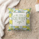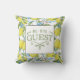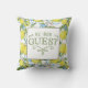 Colourful throw pillow with a lemon pattern that reads: "Be Our Guest".
