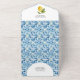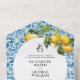 Desigbn features a vibrant, elegant design with blue Mediterranean-style patterns surrounding a central white oval. The monogram at the top adds a personalised touch, while the lemon illustrations provide a fresh, summery feel. The invitation details are presented in a classic, sophisticated font, inviting guests to a wedding at a picturesque location. The overall aesthetic combines traditional and bright elements, making it both timeless and lively.
