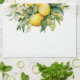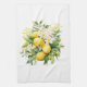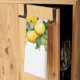 Kitchen towel with a lovely illustration of a bouquet of lemons surrounded by white blossoms leaves and sprigs.