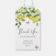 This is a summery and elegant watercolor bridal shower thank you gift tag. The design shows a branch of a lemon tree, its white flowers, green leaves and sweet fluttering butterflies.