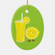 A smiling halved lemon character, standing next to a tall glass of lemonade