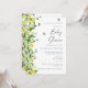 This is a modern citrus themed baby shower invitation. The design shows summery lemon tree branches, white flowers, green leaves and fluttering butterflies.