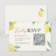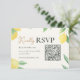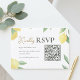 Modern lemon wedding RSVP card featuring watercolor citrus and greenery framing a clean layout with “Kindly RSVP” and a large QR code for easy online responses. Guests can scan the code or visit the printed wedding website, making this card perfect for couples using digital RSVPs for citrus, garden, Italian, or summer weddings. A minimal back with a single lemon adds a refined finishing touch and leaves space for optional handwritten notes.