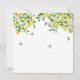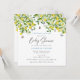 This is a botanical lemon themed watercolor baby shower invitation. The design shows branches of a summery lemon tree, its white flowers, green leaves and fluttering butterflies.
