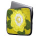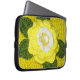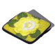 Yellow and green floral image printed on electronics bag is from a photo of an original crocheted creation designed handmade and Copyright © by published designer Delores Chamblin. The picture of the unique handcrafted flower and leaves with visible stitches and pearly button is reproduced on the travel case.