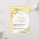 Celebrate your upcoming bundle of joy with this elegant lemon-themed baby shower invitation. Featuring a soft yellow and white gingham background, delicate watercolor lemons, fresh greenery and a blue bow, this design creates a warm and inviting atmosphere perfect for a summer or citrus-inspired baby shower.