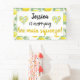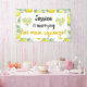 Pretty yet fun lemon themed bridal shower design. Design features a white background with a pattern of lemons and green leaves. In the centre of the design is a white rectangular area. In the white rectangle is customisable text in black font where you can add the bride to be's name. Below is text in black and yellow font that says "is marrying her main squeeze!". There is a heart on each side of the text and the hearts have the same lemon and leave pattern. This adorable lemon main squeeze banner is the perfect addition to your lemon themed bridal shower.