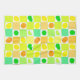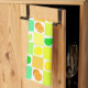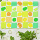 A kitchen towel with a colourful citrus fruit pattern of lemons, limes, oranges and citrus slices on squares of white, orange, teal and yellow.