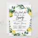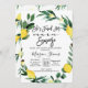 Bold watercolor lemon themed bridal shower invitation featuring a lemon and foliage wreath and black calligraphy text. The design is rustic but modern in style and suitable for an upcoming bridal shower and ideal for someone you likes watercolor invitations.
