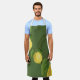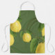 Stylish apron features a modern lemon print pattern in green; fresh yellow lemons complimented with a geometric circle design in green with faint gold accents