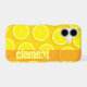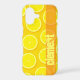 A bold coloured fruity iphone case in bright yellow. A great case for lemon lovers, clementines and other zesty fruits. In this very bright yellow colour finding your phone will be easy. Customise with your first name or family / surname / nickname. Currently reads Clement. Art and design by Sarah Trett.