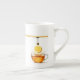 A refined and creative illustration featuring a construction crane delicately lowering a lemon slice into a cup of tea, printed on a premium bone china mug.