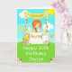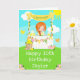 This cute and whimsical birthday card can be personalised with a name or title such as daughter, granddaughter, niece, friend etc. It features a red hair girl with fair skin at a yellow lemonade stand which is decorated with flowers and bunting. In the background is a blue sky, sunshine and butterflies. The text combines decorative and sans serif fonts for a stylish and modern look. This is perfect for a summer birthday party.