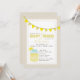 A sip and see invitation featuring yellow bunting at top and an illustration of a mason jar of lemonade at bottom left. Front features lace inspired design. Personalise the text with your information.