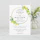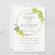 This chic wedding invitation card features a gold circle frame adorned by beautiful watercolor lemons, green foliage and gold foil brush typography. Designed to match our Lemon Azure wedding collection. Personalize it with your details easily and quickly, simply press the customise it button to further re-arrange and format the style and placement of the text.