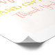 My thoughts on this product was excellent. Well printed in a gloss finishing and just the size l ordered. It arrived in good condition and am overall satisfied with the product. The printing turned out great. I was quite surprised with the finishing touch to the poster. The semi gloss was just right and a perfect size to display at the wedding.