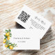Personalise and add your names, wedding website url for your own QR code and text. White background, black text. Decorated with lemons and greenery on the back.