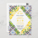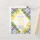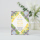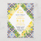 This fun and whimsical save the date postcard features watercolor citrus lemons and foliage on a Mediterranean tile background. The text combines handwritten script and serif fonts for a stylish and modern look. This is perfect for a summer rustic wedding.