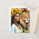 Postcard features watercolor artwork of a pretty, smiling black woman adorned by and surrounded by sunflowers next to a large, majestic lion.
