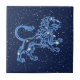 Tile in the zodiac symbol for Leo in soft silver blue, overlaid with the stars of the constellation, against a starry sky background in deep midnight blue