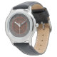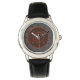 This Leo themed mandala depicts an onyx stone surrounded by the symbol for the sign, the constellation, and the alchemical symbol for Fire among reddish copper filigree and engraved weaves. This watch is available in a variety of sizes, colours, and styles, including sizes for both kids and adults.
