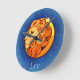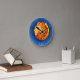 Colourful wall clock features blue background with a lion face, an astrological symbol for Leo.