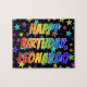 This lively and vibrant birthday-themed jigsaw puzzle design has the message "HAPPY BIRTHDAY, LEONARDO" with the characters having a colorful rainbow spectrum inspired gradient pattern, in addition to an exciting stars background pattern. A vibrant puzzle like this might be a fun way to send birthday wishes to somebody named Leonardo. [~Z0000468]