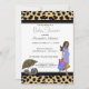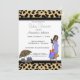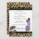 This design features an adorable African-American Mummy-to-be wearing a light purple dress with leopard print accents and leopard print shoes. She is carrying colourful shopping bag and sporting a cute baby bump. There is a pile of coordinated gifts, along with a leopard print umbrella waiting for her in the corner. We have plenty of customisable text for you to add your party information. Leopard print framing along the top and bottom of this trendy baby shower invitation completes the look of this great girly pattern. The reverse side of this invitation has the same leopard pattern. We have matching stamps available too! If you need this design on other products please use the send message feature attached to this store and we will be happy to create that product for you.