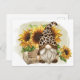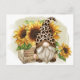 Adorable little gnome in a leopard print has gathered some sunflowers.