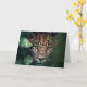 Greeting card shown with a photo print of a beautiful wild leopard among the lush bushes.
