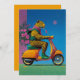 A vibrant, surreal artwork featuring a leopard riding a bright orange scooter against a vivid blue sky. With pink roses in the background and a stylish purple scarf, this scene merges wildlife and urban coolness, creating a whimsical, eye-catching visual.