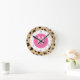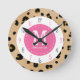 A clock featuring an illustration of a pink circle at centre. Background is leopard print pattern. Numerals are pink and black. Personalise with your name and initial.