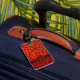 Bright animal print initial monogram luggage tag in red and brown hues. Customise with your address and initial of your choice. Example reads B on front and customise the reverse of this tag with your name and address details. Smart, stylish and unique great for business trips and holidays. Designed by Sarah Trett.
