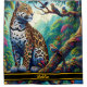 A striking Shower Curtain features a majestic leopard lounging on a vibrant, twisting branch, surrounded by colourful tropical birds and lush foliage, embodying a lively jungle atmosphere.