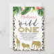 This sweet design features three faux gold glitter safari animals and word. Also included in the design is a leopard skin or cheetah skin pattern and some tropical foliage and flowers. This design is a cute way to invite guests to a first birthday and great for anyone who likes leopard skin patterns.