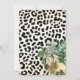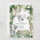 A wild one first birthday gender neutral safari invitation features a tropical jungle with sloth, monkey, giraffe, elephant, toucan, and leopard. Back of invite features leopard print background with tropical plants and lion.
