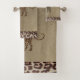 This majestic leopard looks bold amid the brown tan earthy back drop. Animalistic and wild! The leopard print border ties it in to a fabulous finish.