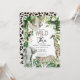 Young Wild and three birthday safari invitation features a tropical jungle with sloth, monkey, giraffe, elephant, toucan, and leopard. Back of invite features leopard print background with tropical plants and lion.