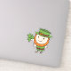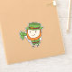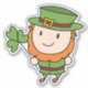 Comical cartoon leprechaun wearing a green hat and suit, has a ginger beard and is holding a lucky shamrock.