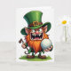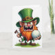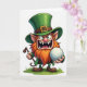 This card shows a full-body cartoon leprechaun centered on a bright white background, drawn with rich greens and fiery orange hair that immediately catch the eye 💚. He wears an emerald top hat with a brown band and gold buckle, plus a matching green coat over sturdy brown boots. His orange beard and wild hair frame a face twisted into a toothy snarl, with icy blue eyes under heavy brows and a pink nose above sharp teeth. In his left hand he grips a knotted wooden walking stick, while his right hand lifts a white golf ball as if showing it off to a close friend with a teasing dare ☘️. The pose feels like a cheeky challenge, like he’s mid-joke and waiting for someone to laugh or answer back. Any greeting text would sit best above his hat or below his boots in green lettering so it stands out against the white space. A small strip of green grass runs along the bottom edge beneath his boots.