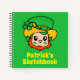 Custom leprechaun sketchbook includes a first name monogram (or other text) in yellow with a leprechaun with four leaf shamrock on hat. Perfect for St. Patrick's Day!