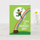 This card shows a cheerful leprechaun mid-leap, dressed in an emerald suit and top hat, with a bright red beard and a wide smile that feels like it’s meant for a close friend 💚. Behind him, a crisp white circle frames his dance like a spotlight, making his pose look even more lively and inviting. A green shamrock floats above, echoing his upbeat gesture and adding a lucky touch ☘️. A rainbow stretches diagonally from the upper right, guiding your eye down toward a dark brown pot packed with shiny gold coins in the lower left. The background is lime green with a darker green arc, giving the scene a layered, outdoorsy feel without adding extra clutter. The greeting “Happy ST. PATRICK’S DAY!” sits prominently near the top in white letters, standing out clearly against the green. Small details like the leprechaun’s buckles and the distinct rainbow bands are drawn with crisp edges and flat color. The pot is rounded and shadowed in deep brown, with bright yellow coins stacked and spilling upward beneath the rainbow’s end.