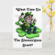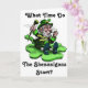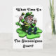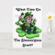 An Irish leprechaun sitting on a shamrock clover. He's asking 'What time do the shenanigans start? Great for St. Patrick's Day!