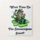An Irish leprechaun sitting on a shamrock clover. He's asking 'What time do the shenanigans start? Great for St. Patrick's Day!