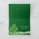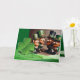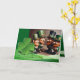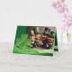 Four miniatures of Leprechauns + four-leaf clover + stylised green hills + St Patrick's Day. Design on horizontal greeting card with texts to customise inside with the same clover and hills.